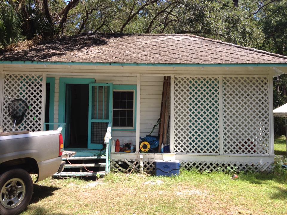 Nick’s mom, Nancy, had just found a cute vacation cottage down on the Ochlockonee Bay in Wakulla County. It was really easy for us to envision ourselves living there. The large swaying oak trees and tall tall pines along the bay, easy access to go fishing or cruise around on a boat, the peace and quiet of being away from the city. We made great friends with the neighbors across the street from Nancy’s cottage, Bob + Ginger White. Their home was nestled right along the water and they had this great long boardwalk that jutted out into the bay. They also happened to own the small “shack” across from their home and right next door to Nancy’s place. Long story short... The little piece of land with that shack became ours!